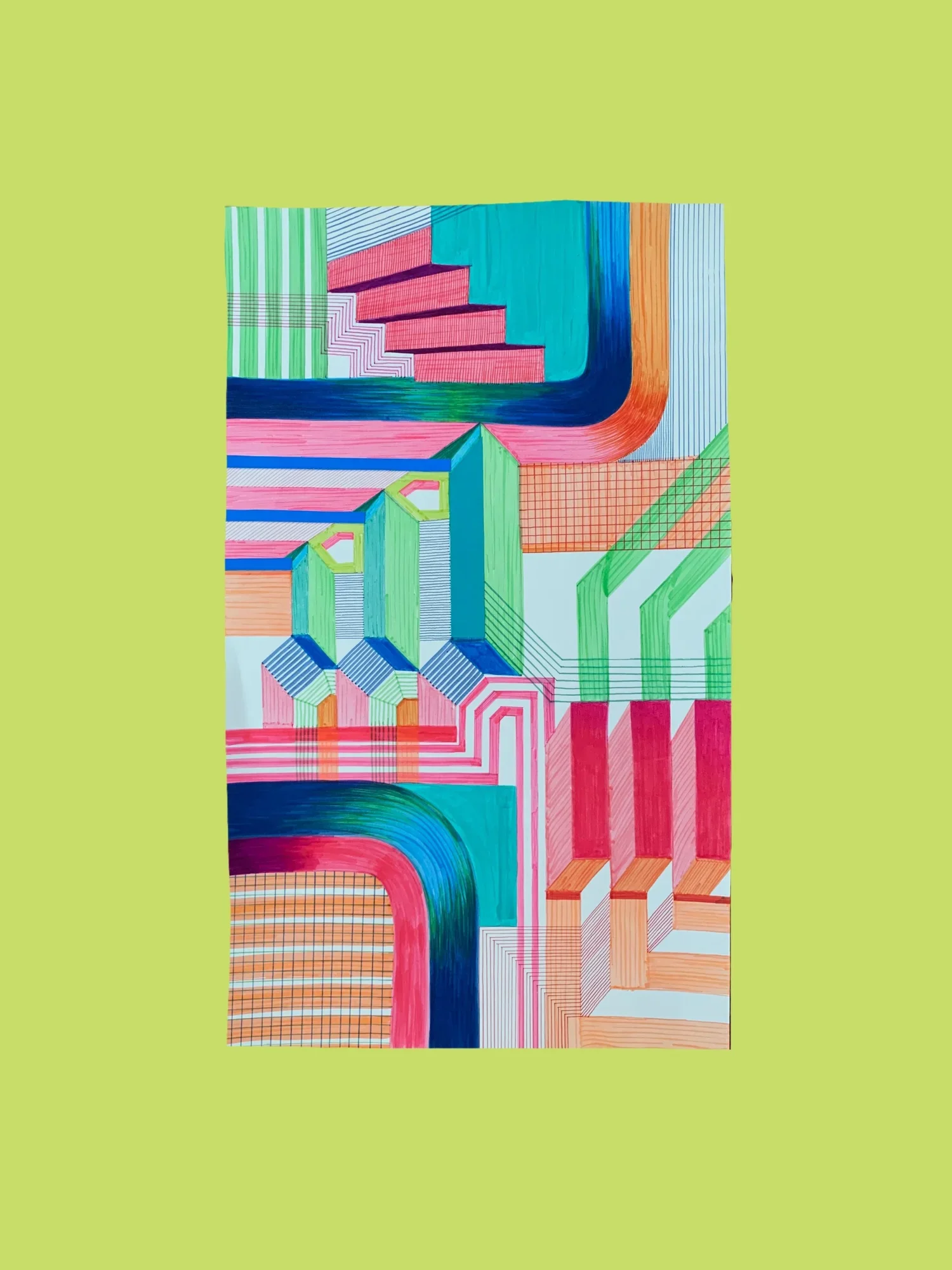 Lily Mueller is a multidisciplinary artist based in Kansas City, Missouri. Mueller explores the processes of quilting, painting, collage and installation while integrating them with concepts of psychedelia, architecture and mid century modern design. Much of her inspiration comes from performing and listening to music alongside memories of her childhood and Nicaraguan heritage. She has been largely influenced by her fathers career as an architect, his interest in 60’s psychedelic light shows, and her mothers love for textiles and fashion. Mueller received her BFA at the Kansas City Art Institute in 2020 and now continues to exhibit her work in Kansas City and across the country.